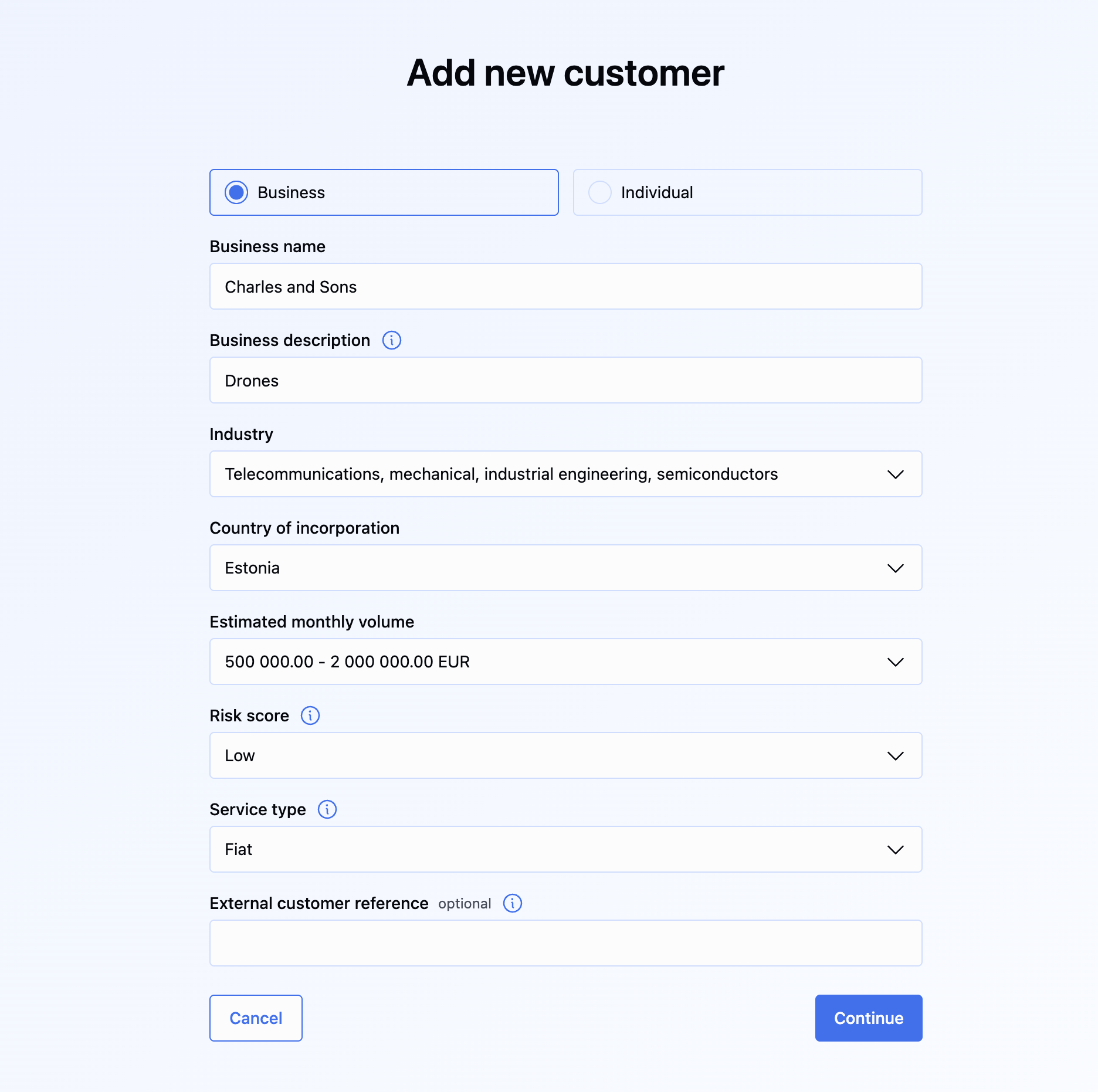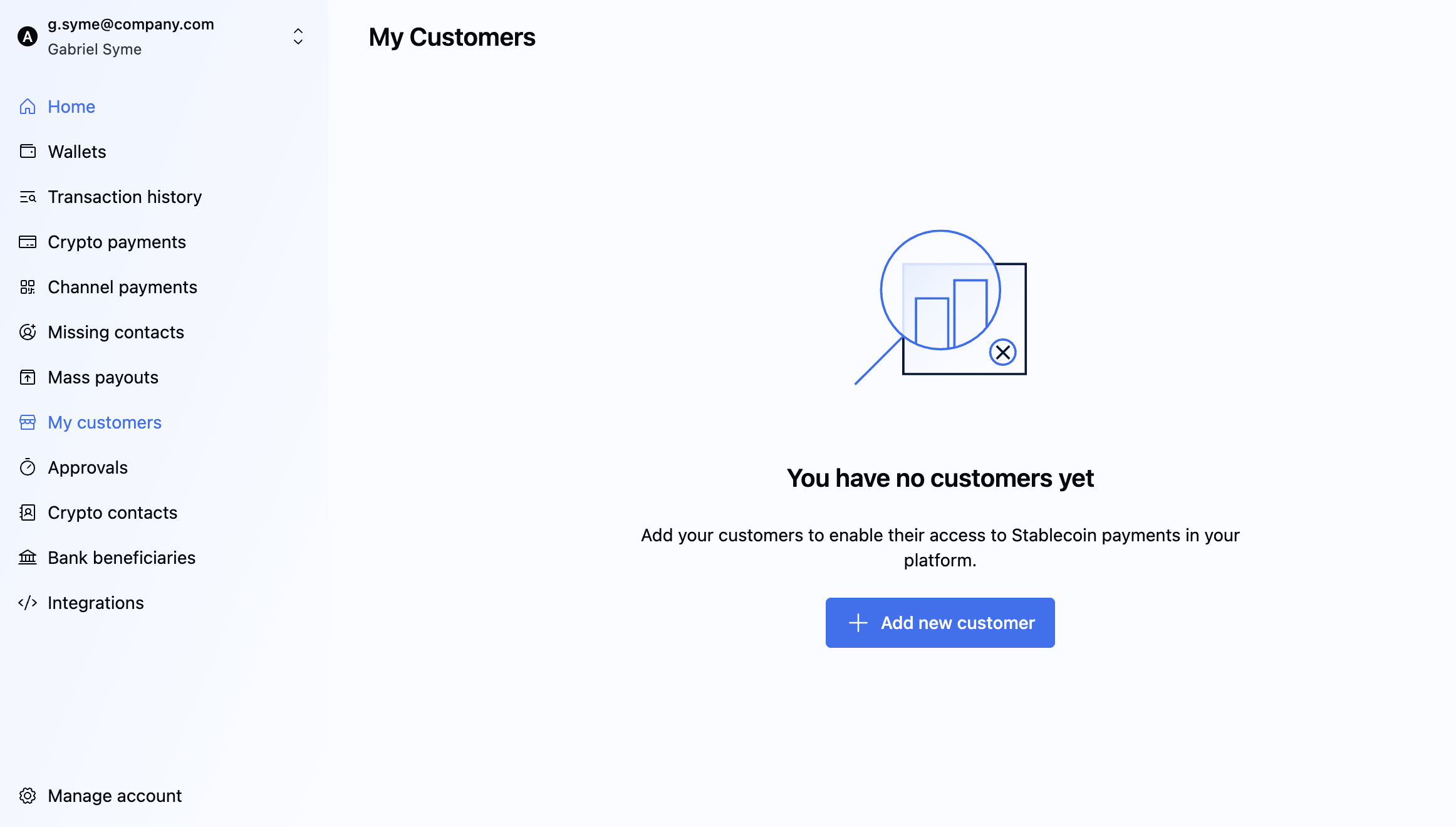 This step allows the creation of a new customer on the BVNK platform to whom wallets can be assigned. For example, if your company is a financial institution that services businesses, you would first need to add the customer under the My customer section of the BVNK platform. This will facilitate your customer's execution of payments via BVNK through your platform.