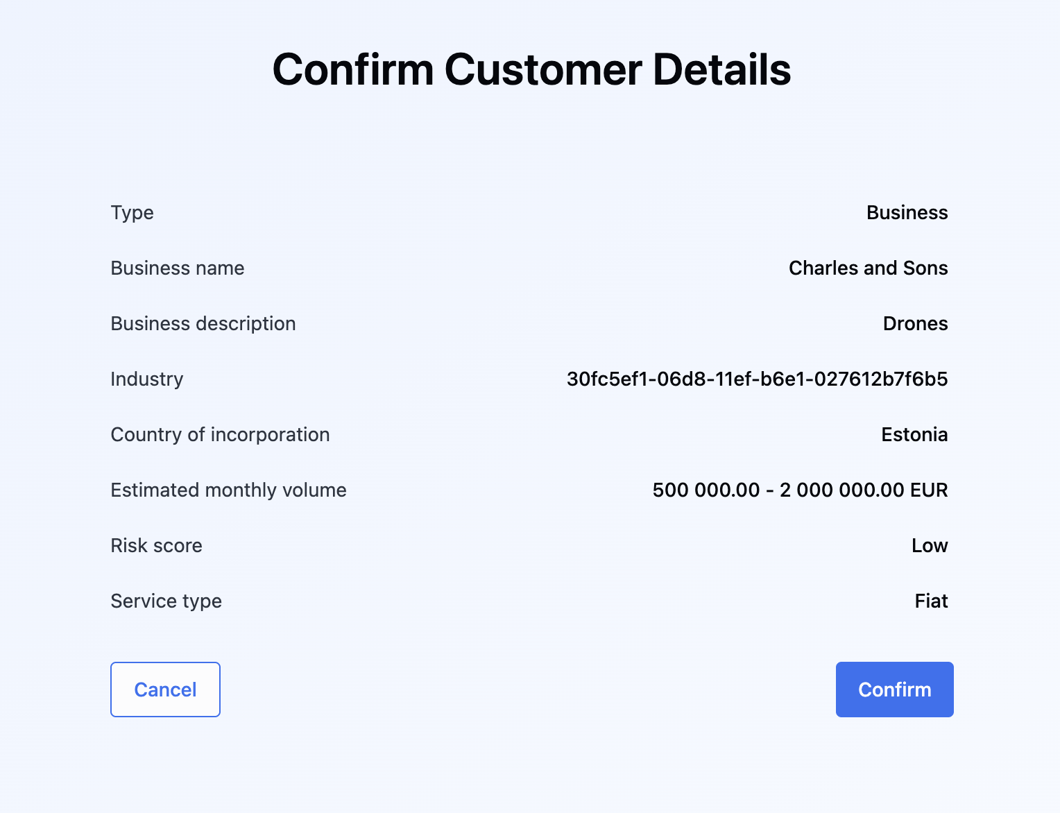 - Collect and validate customer data (IDs, address proofs, and so on) before creating the customer. This is crucial for a smooth KYC/KYB flow.