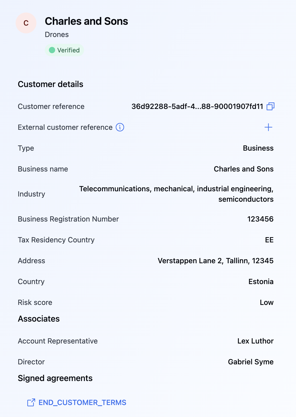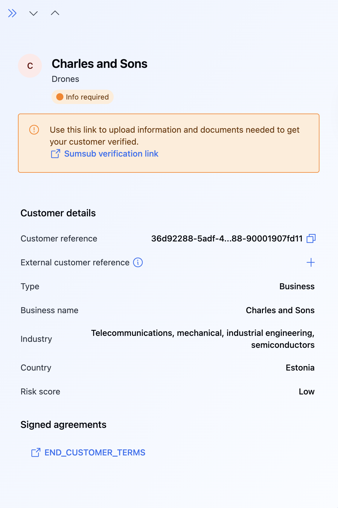referencefrom the signed agreement session and include it in the request payload as thesignedAgreementSessionReferencefield. This ensures the agreements are correctly linked and recognized in your new customer creation and onboarding. - Learn about required compliance documents for company and individual customers and add them for your customer.