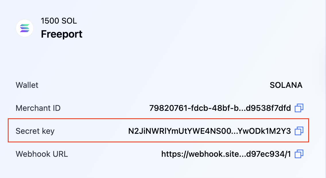 Obtain the secret key: go to Manage Account > Manage Merchants, and click a Merchant Name to open its details.