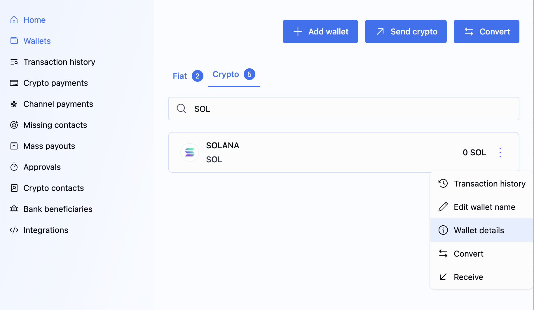 BVNK offers capabilities to create and manage crypto wallets directly from within the BVNK portal.