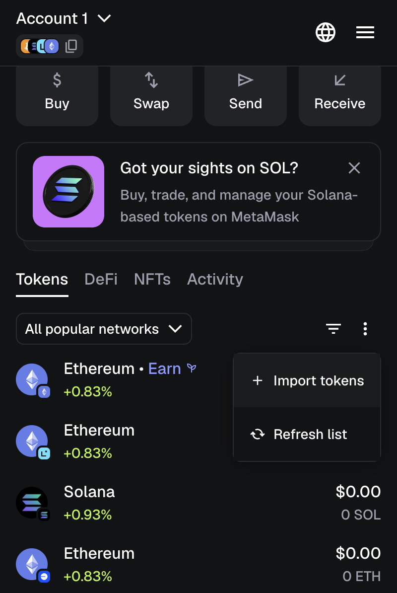 - Import tokens by adding the smart contract to your wallet. For that, in your MetaMask wallet, on the Tokens tab, click Import tokens.
