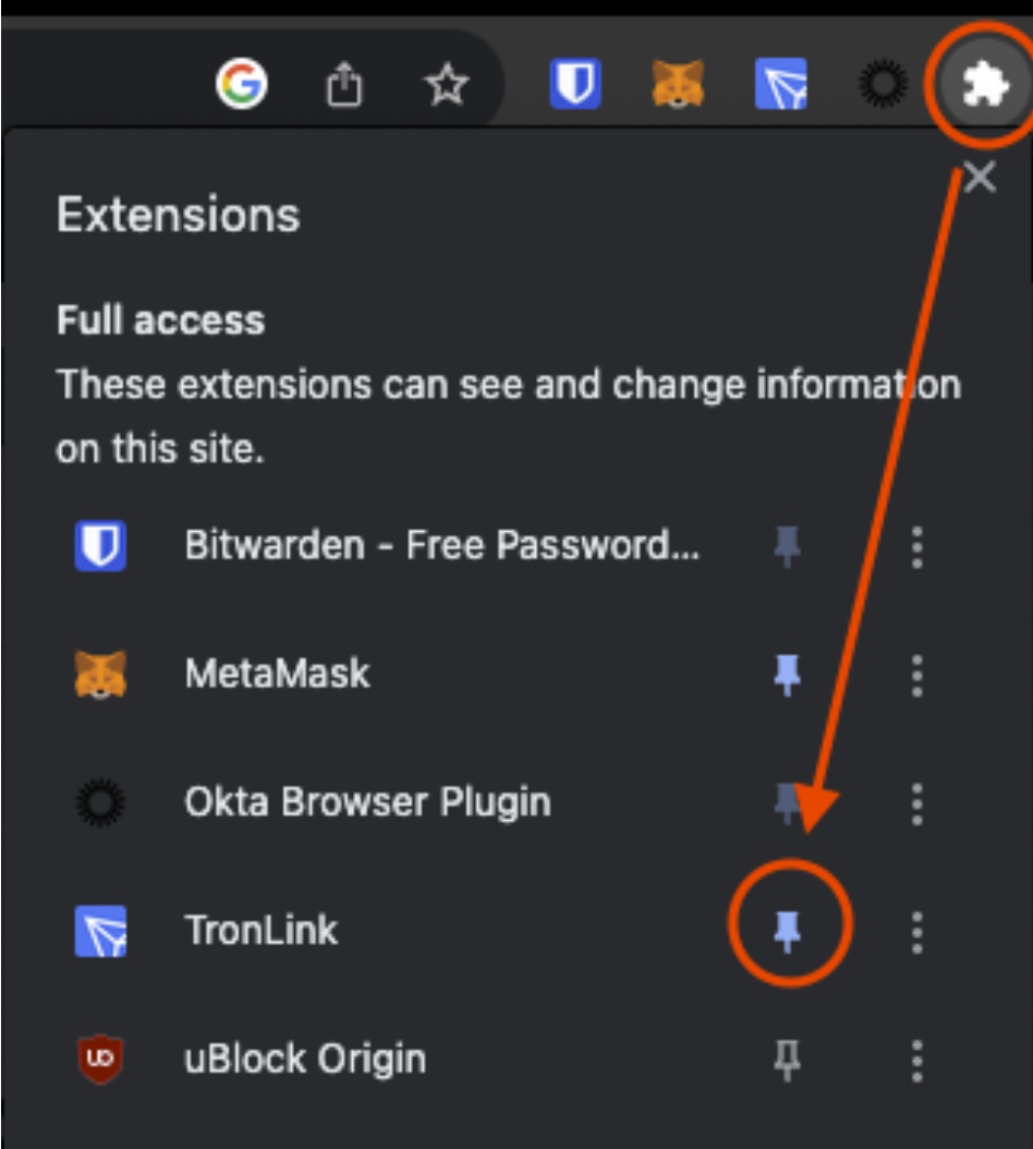 - Optional. Pin the extension to your browser by clicking the Puzzle icon > Pin icon next to TronLink.