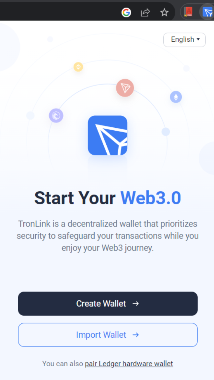 - Click the TronLink icon to open the extension, and then click Create Wallet. Follow the steps carefully and save your password and recovery codes in a safe place.